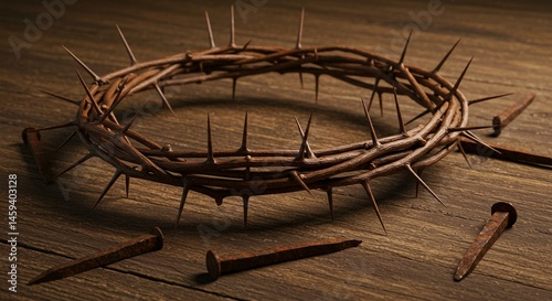 A crown of thorns and nails resting on a wooden surface in a dimly lit and somber setting image