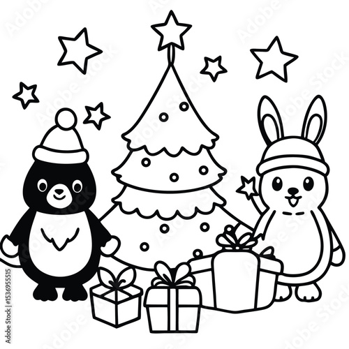 A cute cartoon vector set of Christmas and New Year holiday icons, including Santa, snowman, tree, gifts, and snowflake decorations for December celebration design