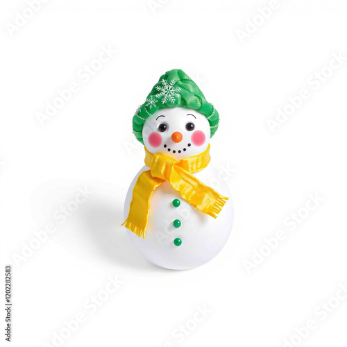 A cute, festive snowman with a yellow scarf and green hat. This holiday design is perfect for seasonal branding and mockups.