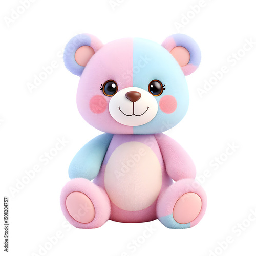 A cute pastel teddy bear with pink and blue fur sitting upright with a sweet smile on a black background isolated with white background