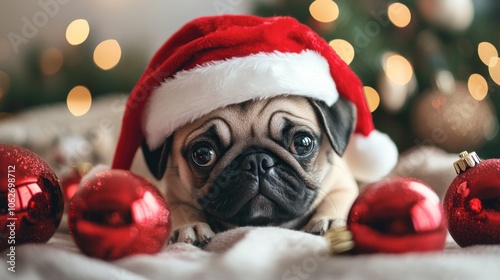 A cute pug puppy wearing a Santa hat and surrounded by red Christmas ornaments.