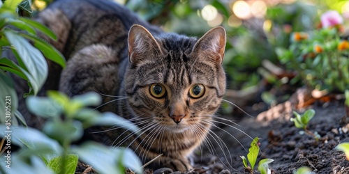 A cute tabby cat is hiding in the garden, waiting to pounce on its prey.