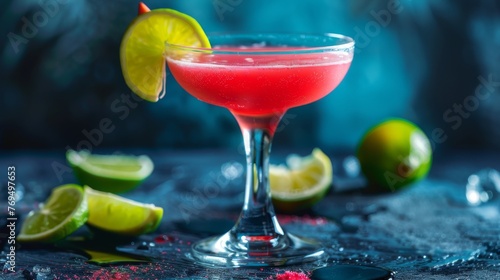 A Daiquiri cocktail presented against a blue background. An alcoholic beverage served in a glass.
