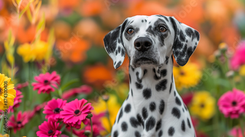 A Dalmatian stands against a colorful flower garden backdrop. The vibrant flowers highlight the dog's black and white spots, creating a lively, charming scene.
