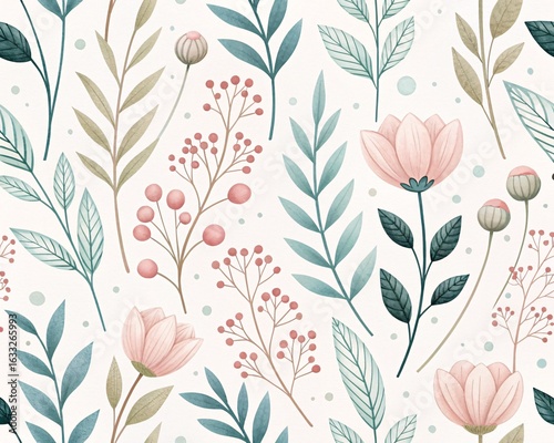 floral, pattern, watercolor, botanical, flower, blossom, leaf, foliage, berry, stem, nature, garden, spring, summer, delicate, soft, gentle, pastel, pink, reddening, peach, sage, green, teal, blue, red, rose, bud, germinating, vine, organic, textile, fabric, design, illustration, art, vintage, retro, country, farmhouse, wallpaper, scrapbooking, background