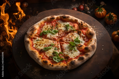 A delicious, small-sized freshly-made margarita cheese pizza rests on a cutting board with garnish and flames in the background. Cut and ready to be served at the restaurant.