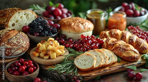 bread, cheese, fruit, food, bakery, dinner, snack, epicure, delicious, fresh, rustic, table, plate, serving, meal, widener, grape, berry, blackberry, cranberry, red, yellow, brown, wooden, board, bowl, jam, jar, round, square, natural, homemade, pastry, baking, culinary, styling, photo