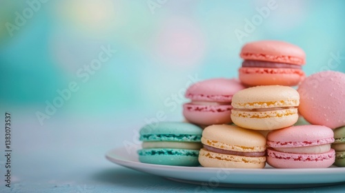A delightful assortment of pastel-colored macarons elegantly arranged on a small white plate with a soft blurry background of light blue-green hues