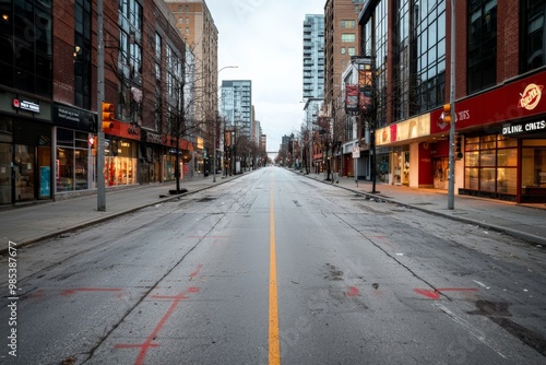 A deserted downtown area, formerly bustling with commerce, now empty and silent, depicting the economic devastation