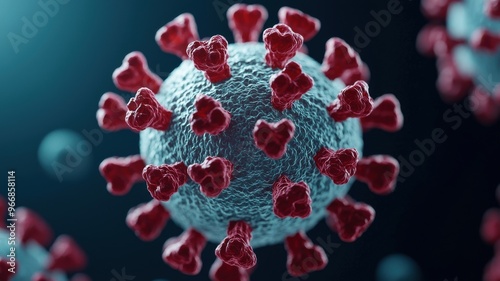 A detailed close-up of a virus particle, showcasing its structure and features in a scientific context.