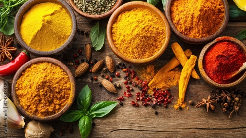 A detailed view of a table showcasing an assortment of bowls filled with vibrant spices and fresh herbs, highlighting their textures and colors.