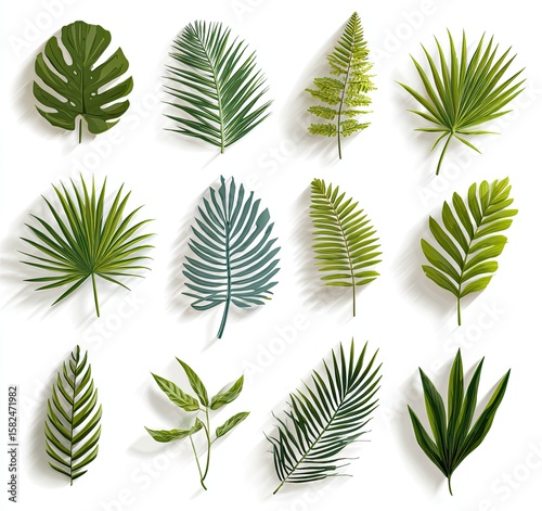 leaf, tropical, semitropical, green, foliage, plant, flora, nature, illustration, digital, art, design, shadow, white, background, realistic, detailed, vibrant, lush, exotic, palm, fern, monstera, tree branch, sprig, greenery, pattern, texture, botany, element, graphic, image, collage, collection, variety, assortment, diversity, visual, aesthetic, beauty, organic, natural, bright, colours, summer, fresh, style, botanical