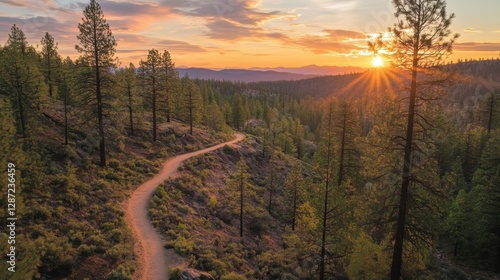 trail, forest, tree, path, sunset, sunrise, sun, nature, landscape, outdoors, scenic, cloud, sky, light, evening, morning, dawn, dusk, view, adventure, explore, travel, journey, mountain, hill, green, brown, gold, orange, yellow, peaceful, calm, serene, quiet, wilderness, hiking, walking, dirt, grass, pine, distant, elevated, up high, dramatic, beautiful, natural, idylli
