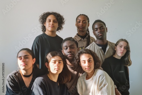 diversity, oneness, contemplation, togetherness, group picture, natural light, portrait, expression, casual clothes, youthful, solidarity, community, minimalist, white background, modern, connected, gathered, identity, representation, simple, artistic, casual attire, harmony, stylish, relaxed, thoughtful, engaged, multicultural, friendship, lifestyle, inclusive, casual attire, kinship, contemporary, united, collective