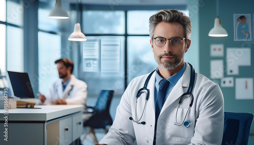 A doctor in a modern clinic, wearing a white coat and stethoscope, consulting with a patient