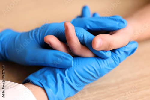 A doctor in medical gloves holds a child's hand. Interaction and support.