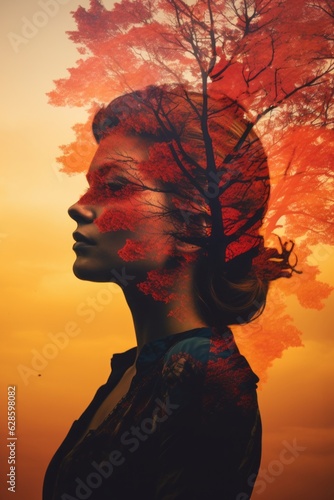 a double exposure of a womans face with a tree in the background