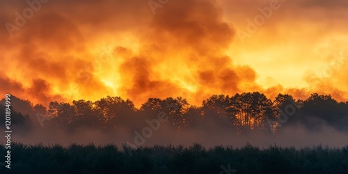 A dramatic scene of a forest fire consuming trees, representing the environmental disaster caused by human actions and the urgency for global conservation efforts.