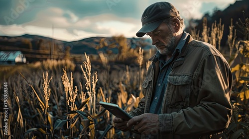 A farmer works on an electronic tablet in the field while a tractor is working on the field, with the field in the background. Considering the time of day to work the plantation fields.