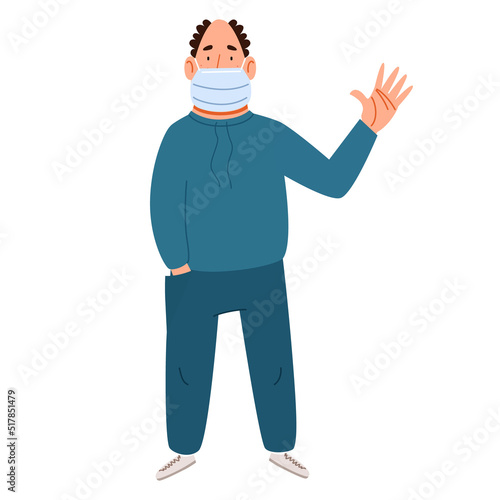 A fashionable man in a medical mask greets. Friendly greeting of a bald guy. Vector illustration in a flat style, isolated on a white background.