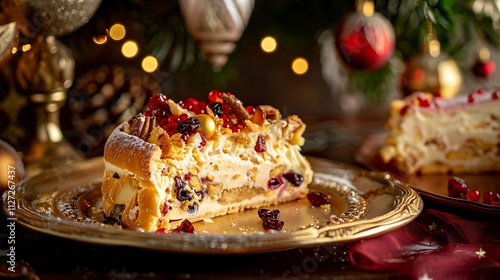 cake, christmas, dessert, holiday, sweet, delicious, food, bakery, pastry, creamy, winter, festive, treat, sweetness, sugar, whipped, cream, fruit, cranberry, pecan, nut, gold, plate, deliciously, tasty, celebration, party, epicure, baked, confectionery, culinary, appetising, deliciously, delightful, seasonal