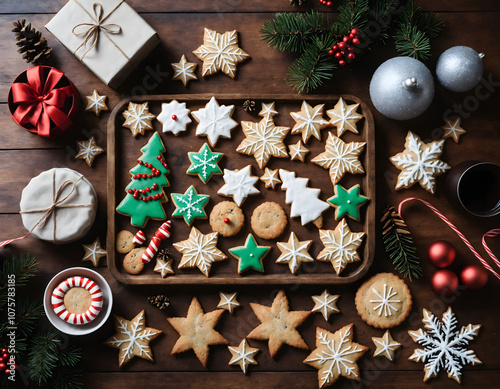 A festive Christmas spread with a variety of beautifully decorated cookies, wrapped gifts, and other holiday decorations.