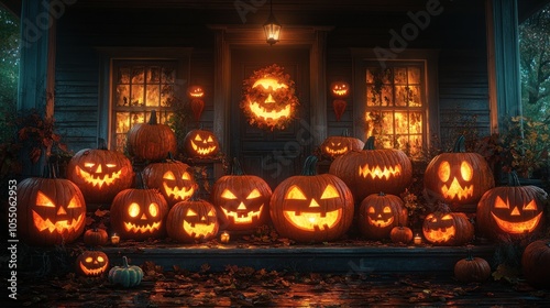 pumpkin, halloween, skittish, decoration, autumn, porch, light, face, carved, glow, festive, orange, night, celebration, harvest, leaf, smile, creepy, atmosphere, tradition, gathering, fun, eerie, seasonal, creative, artistry, joy, community, nature, shadow, warmth, spirit, lantern, cheerful, vibrant, display, family, friends, gloaming, cosy, inviting, holiday, culture, festivity