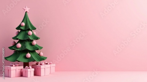 A Festive Pink Christmas Tree with Presents on a Soft Pink Background