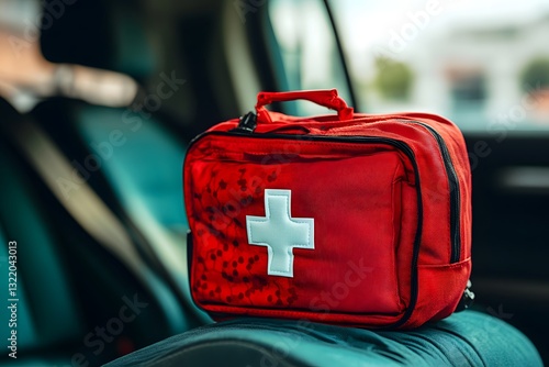a first aid kit sitting on a car seat.