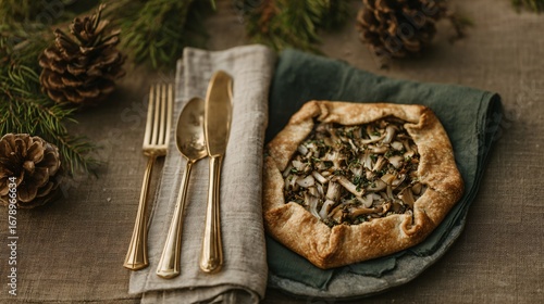 A flat lay of savory galette with mushrooms, leeks and gruyère, linen napkins, brass cutlery, forest green accents, top-down autumnal styling