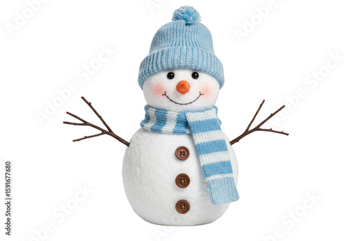 A friendly snowman dressed in a blue knitted hat and striped scarf, with twig arms, isolated on a transparent background