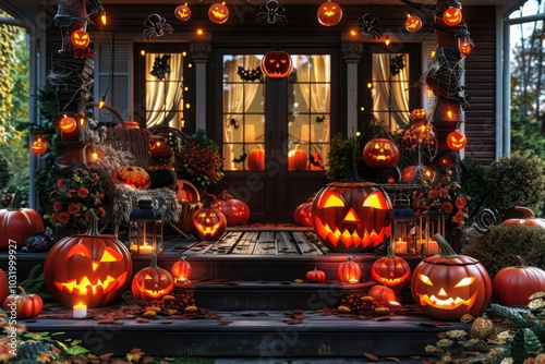 A fully decorated porch with jack-o'-lanterns, lanterns, and Halloween lights, creating a spooky and festive Halloween ambiance.