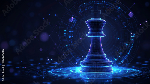 A futuristic chess piece icon with strategy data surrounding it, symbolizing online gaming platforms, virtual tournaments, and digital strategy tools.