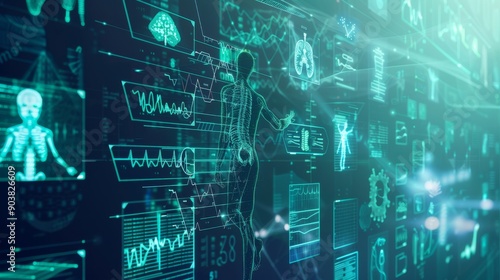 A futuristic digital interface showing human anatomy and health analytics, symbolizing the integration of technology in healthcare.