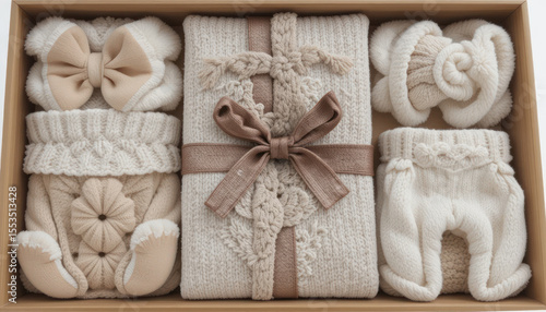 baby, gift, set, knitted, clothes, hat, foulard, leggings, shoes, beige, cream, box, present, warm, accessory, infant, fashion, cute, adorable, gift wrap, design, soft, comfort, newborn, toddler, package, hand-made, stylish, bundle, outfit, decoration, bow, lace, pattern