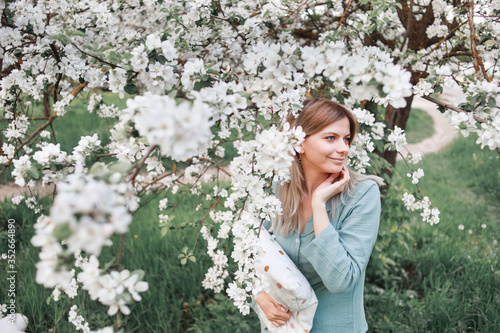 a girl hugs a large pillow with a casual expression on her face on a day off wears sleeping blue pajamas in a blooming Apple orchard