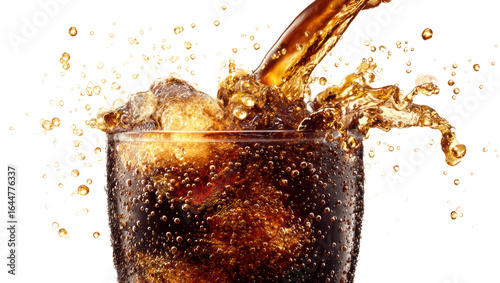 A glass of cola with ice, splashing as it is poured, showcasing bubbles and effervescence.