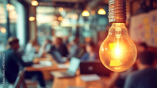 A glowing light bulb in a collaborative workspace with people engaged in discussion.