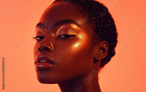 A glowing woman with golden-bronze eyeshadow, rosy cheeks, and a clear lip gloss, set on a pastel peach background