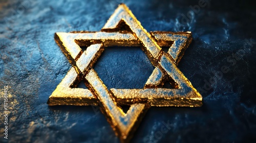 A gold and blue Star of David against a dark blue background, a striking symbol of Judaism. Concept of a symbolic representation of Jewish heritage.