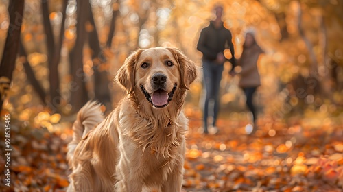 A golden retriever dog with a happy expression looks directly at the camera, standing in a forest with fall foliage behind it, as two people walk by in the background.