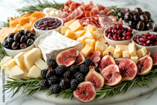 A Gourmet Cheese Board with Figs, Blackberries, Rosemary, and Olives