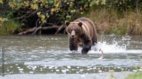a greezly bear hunting salmons in a river in Alaka