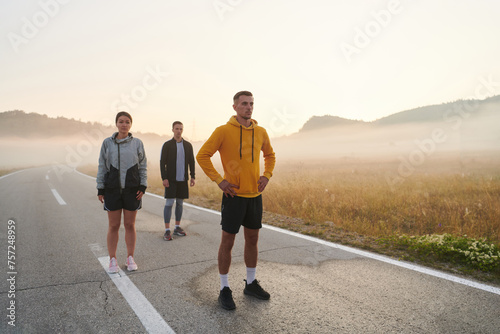 A group of friends, athletes, and joggers embrace the early morning hours as they run through the misty dawn, energized by the rising sun and surrounded by the tranquil beauty of nature