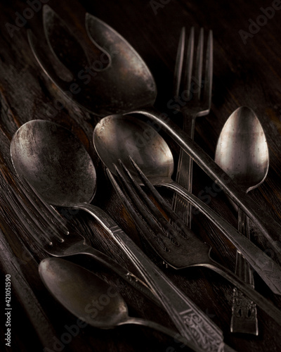 fork, spoon, cutlery, silverware, silver, kitchen, utensil, steel, metal, table, dinner, food, set, fork, crockery, flatware, utensil, meal, dining, stainless, equipment, wood, dark, colorless