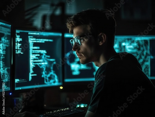 a hacker sits focused at a dark workstation, illuminated only by the glow of multiple screens. the atmosphere is tense and secretive, capturing the essence of cybersecurity and the digital realm