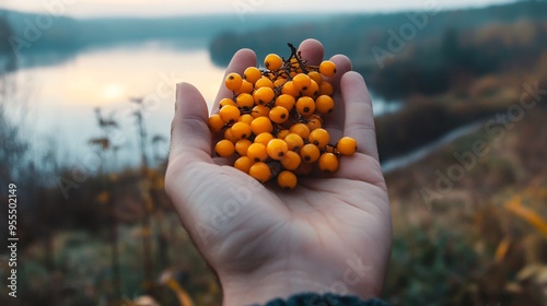 A hand holding a bunch of sea buckthorn berries, with a beautiful outdoor landscape in the background