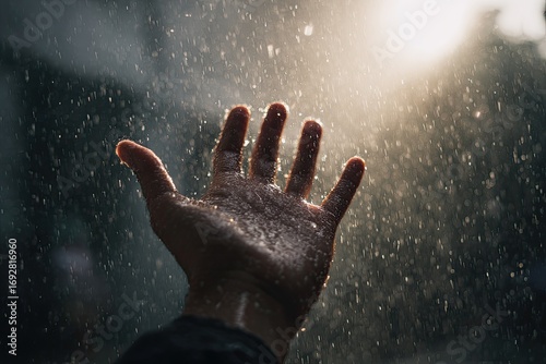 hand, rain, sunlight, water, reaching, open, sky, nature, light, dark, contrast, wet, droplet, warm, bright, shadow, perspective, sharpened, closeup, detail, texture, moisture, illumination, spiritual, hope, faith, blessing, divine, renewal, growth, grace, energy, power, inspiration, moment, beauty, pure, clear, fresh, tranquil, calm, positive, awe, wonder, connection