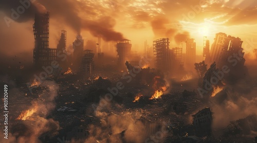 A haunting depiction of a post-apocalyptic abandoned city, with destroyed buildings looming amidst a landscape of burning rubble, the air thick with pollution and smoke