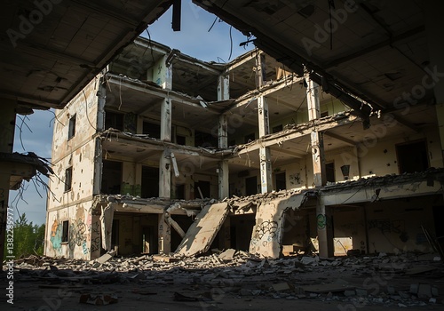 destruction, ruin, building, crumbled, war, disaster, damage, abandoned, decay, debris, debris, ghost, skeleton, empty, window, floor, sunlight, sky, sombre, melancholic, loss, history, time, weight, abandonment, perspective, structure, broken, shattered, hollow, lifeless, desolate, grim, tragedy, aftermath, devastation, despair, haunting, eerie, forgotten, disused, silence, emptiness, shadow, light, contrast, grey, white, brown